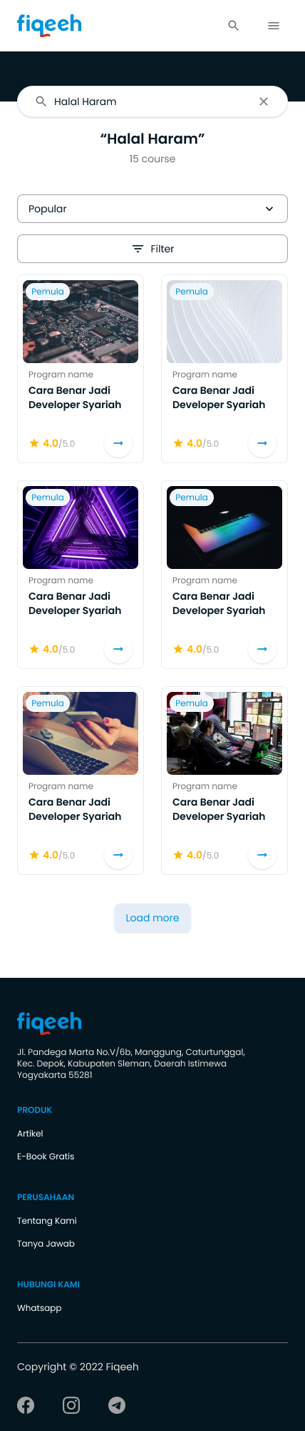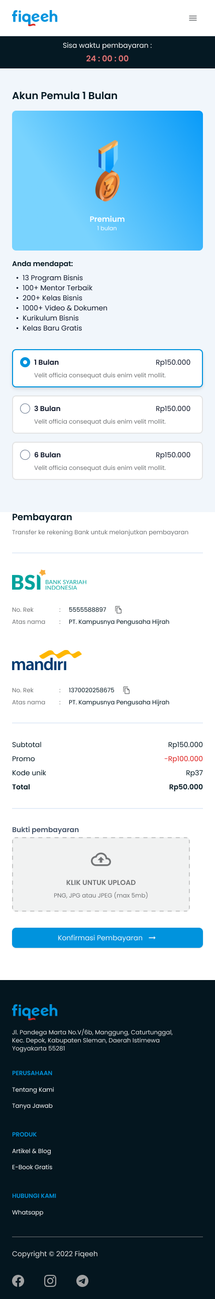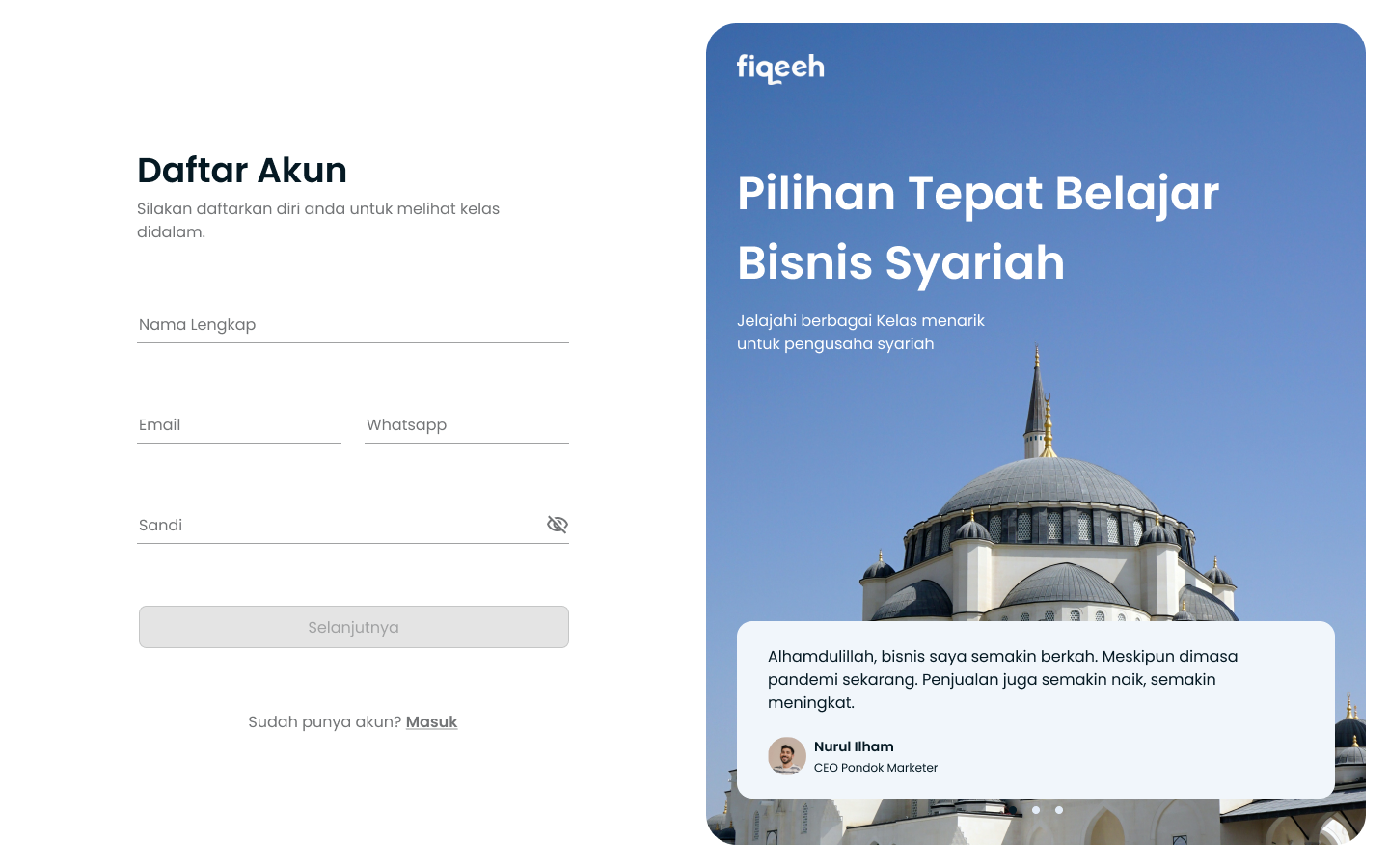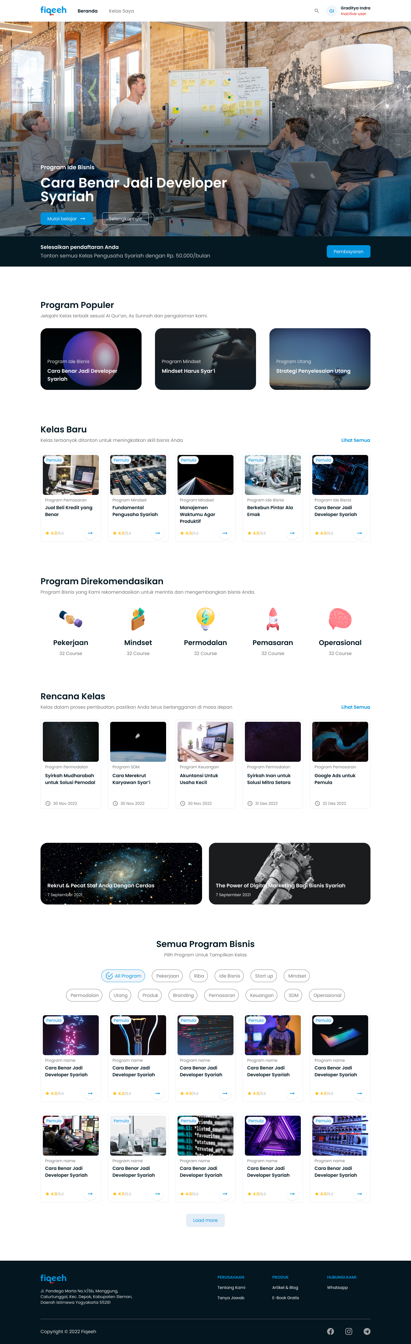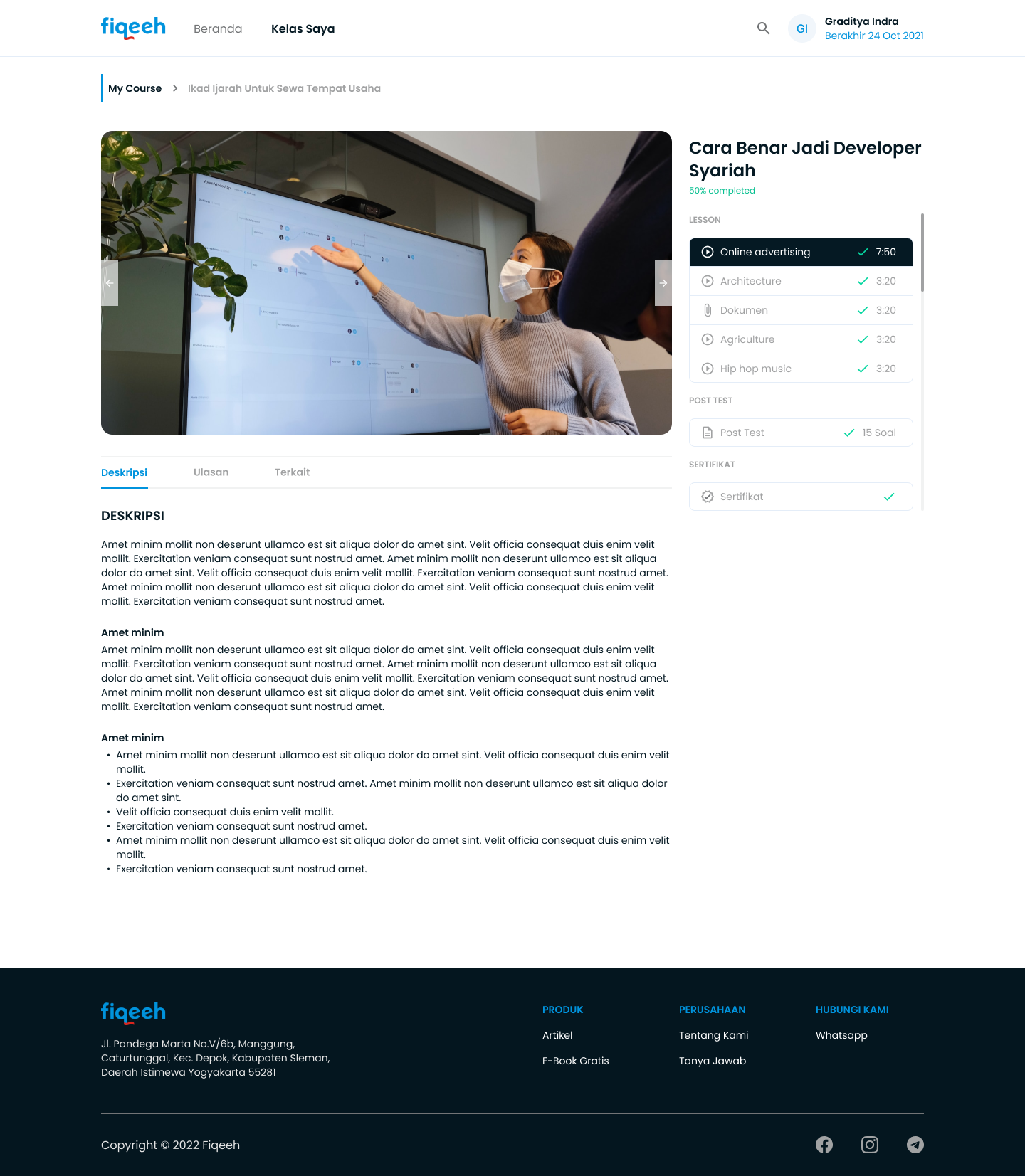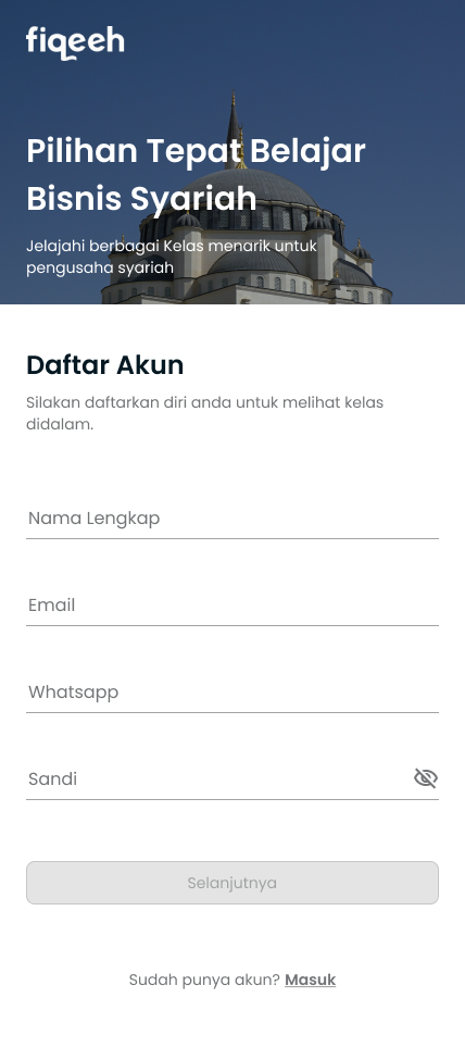 Fiqeeh adalah website pembelajaran seperti Udemy atau Coursera yang berfokus pada pembelajaran agama islam untuk para pembisnis yang ingin berbisnis sacara syariah. Fiqeeh membantu para user nya yang ingin mendapatkan ilmu bisnis yang halal dan anti riba. Output dari projek ini adalah sebuah website yang mudah dipahami usernya yang sudah diresearch oleh foundernya dan mengurangi kesalah pahaman dari desain yang sudah ada untuk melakukan login dan pembayaran untuk berlangganan kelas kelas Fiqeeh.